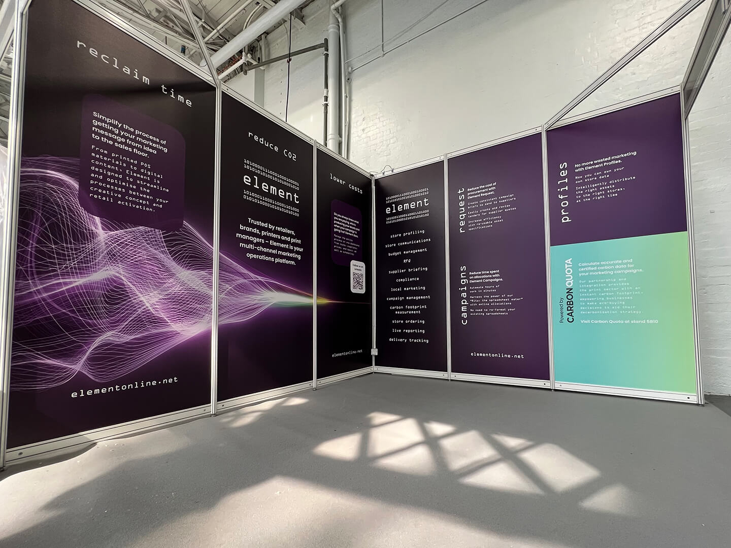 Working with the team at Element was a great experience for us. The shell scheme structure was simple, which allowed us to devote our time to creating their new brand creative. We were also able to produce the booth panels using fully recycled display materials, which was essential to both of our businesses.